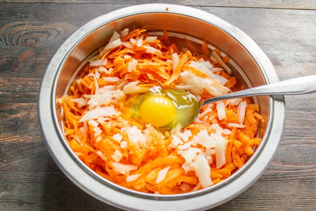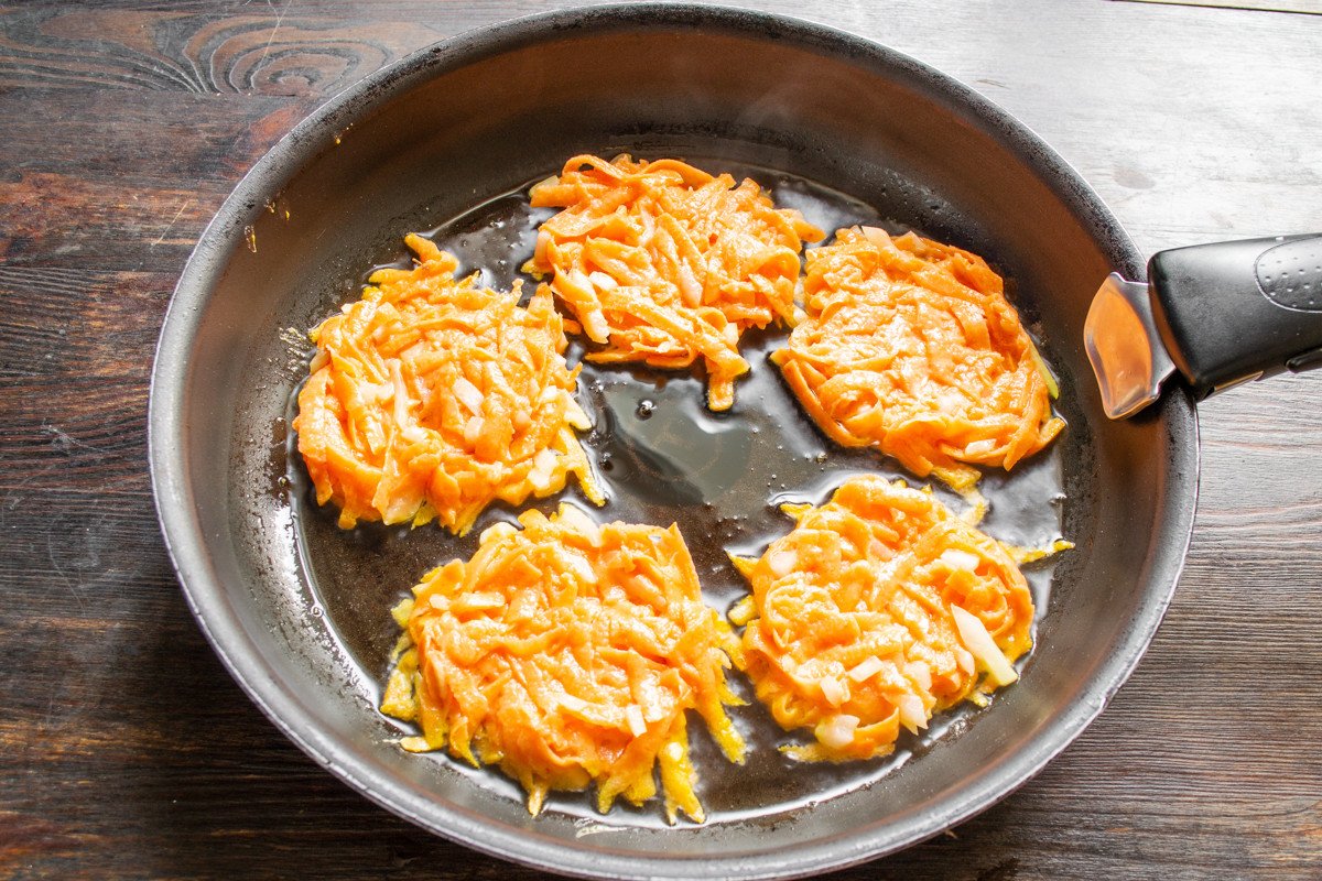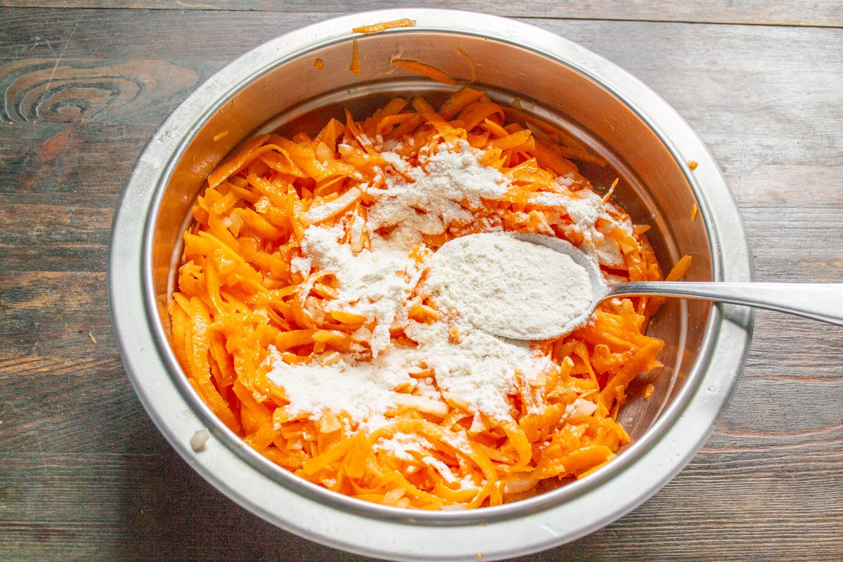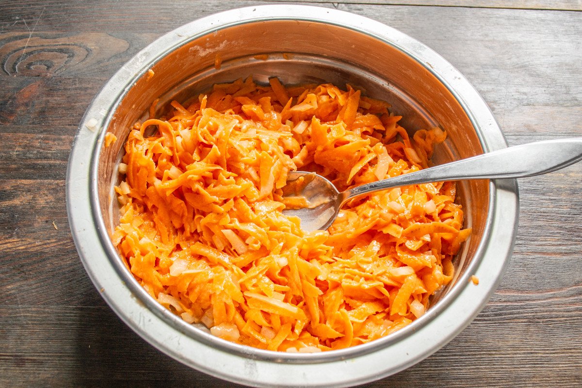 Gerai išmaišykite tešlą, permetant daržoves, kad suminkštėtų ir suliptų. Galima palikti 30 min. ir dar kartą permaišyti. Batatuose beveik nėra krakmolo, skirtingai nei bulvėse.
