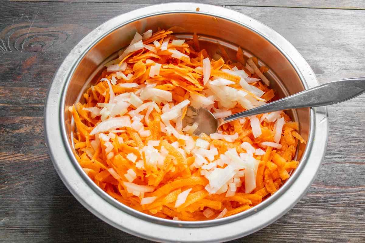 Smulkiai supjaustykite svogūną, suberkite prie batatų. Įberkite druskos. Druska ištraukia daržovių sultis, todėl galima rankomis pertrinti masę.