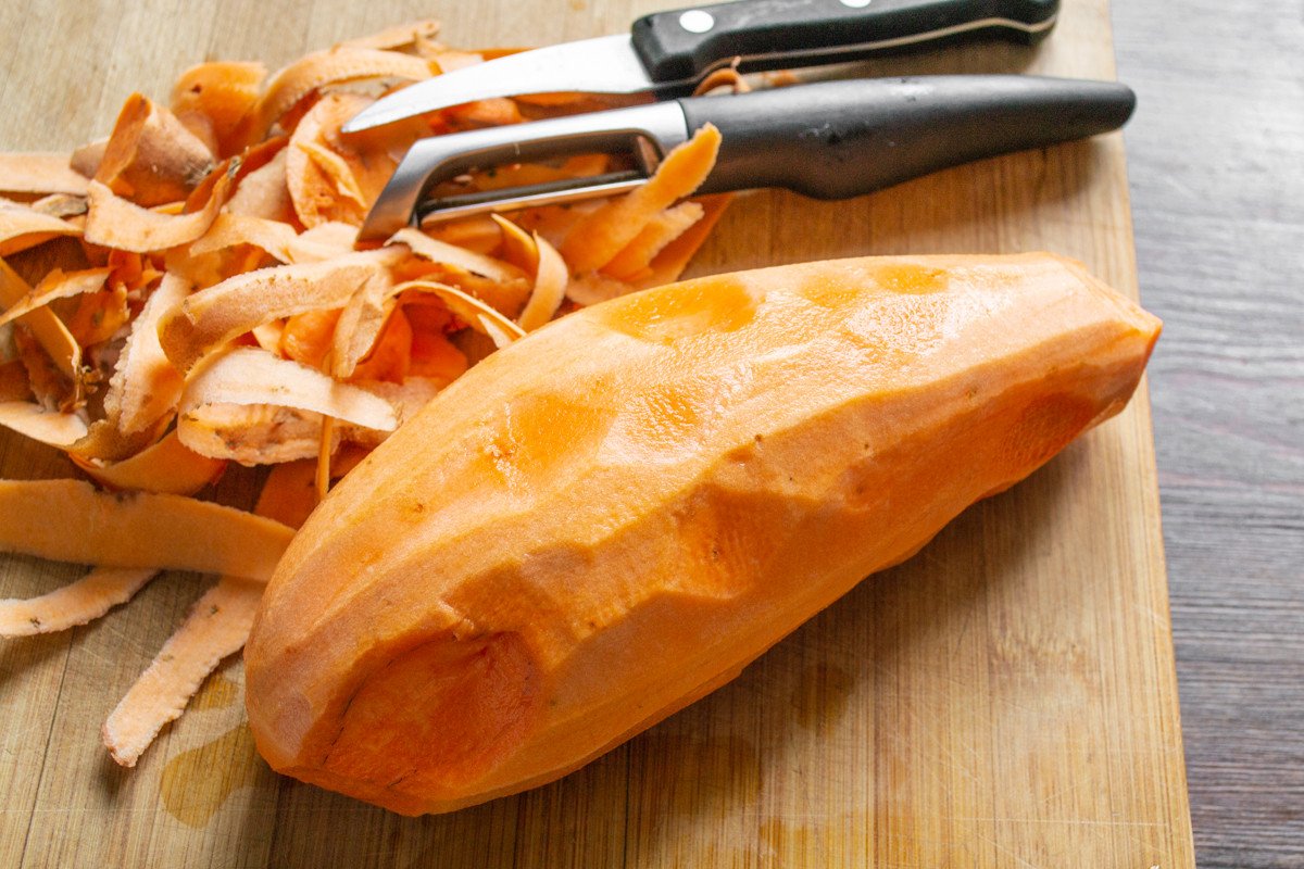 Batatus nuplaukite, nulupkite. Skonis, spalva ir forma skiriasi nuo įprastų bulvių, bet ruošiami panašiai. Šiame recepte naudojami oranžiniai batatai.