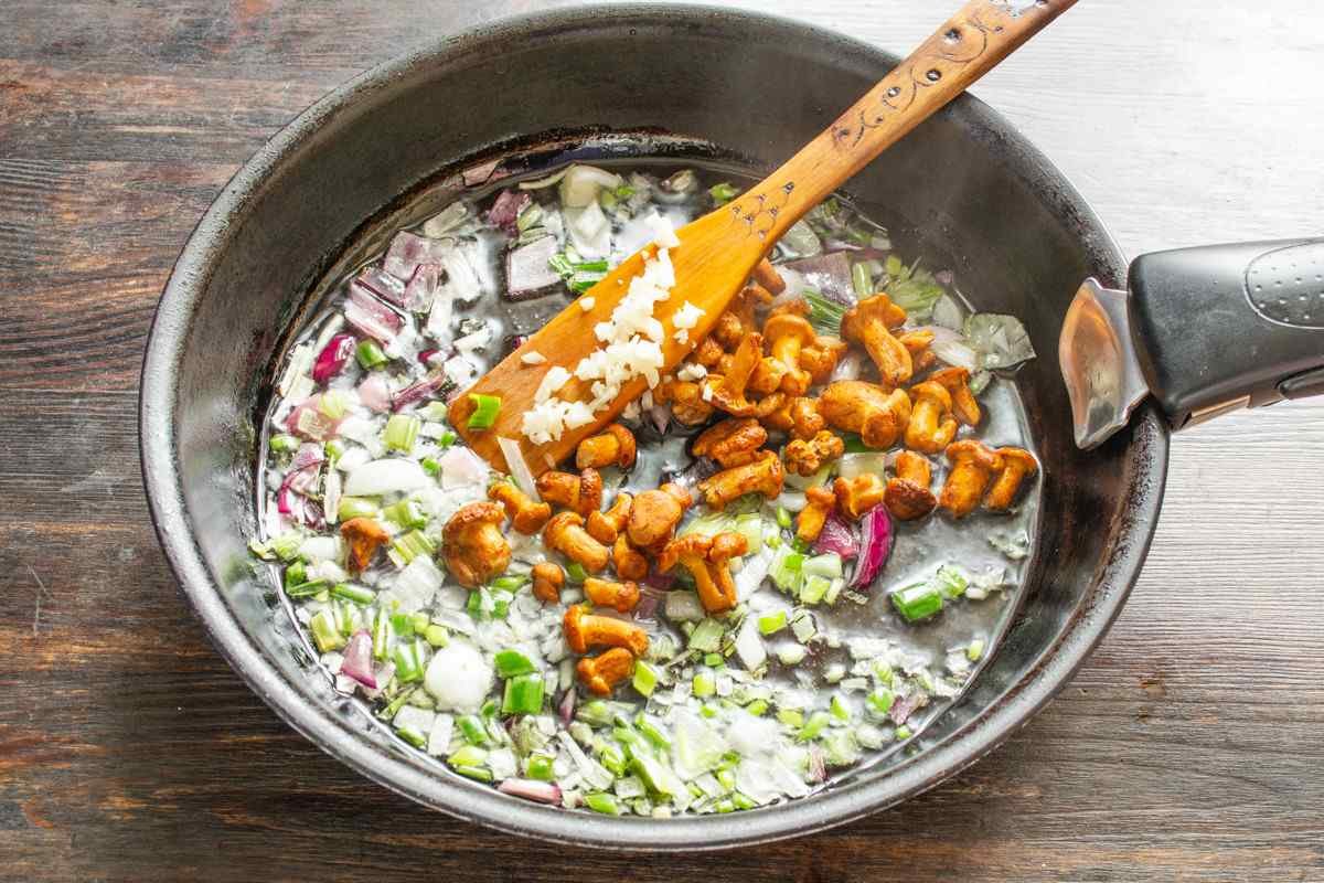 Smulkiai supjaustykite česnaką, suberkite į keptuvę su voveraitėmis. Kepkite 5 min. ant vidutinės ugnies, pabaigoje pasūdykite.