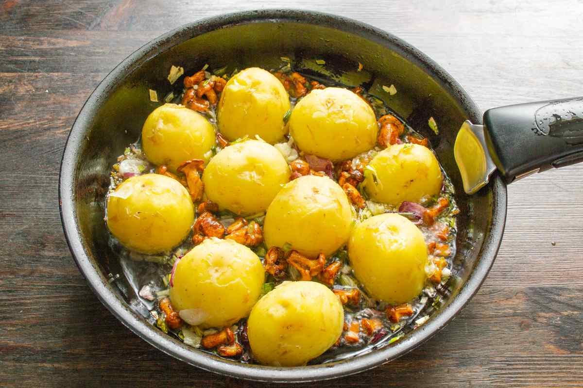 Dėkite bulves į keptuvę prie grybų. Kepkite ant vidutinės ugnies, kol apskrus, dėkite pjūviu žemyn, retkarčiais pakratykite keptuvę.
