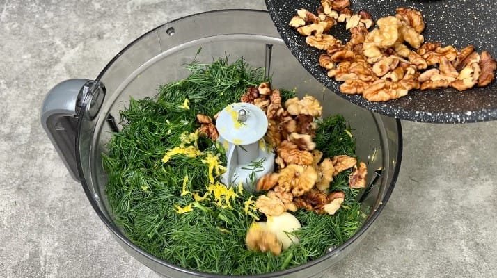 - Graikinius riešutus užpilkite verdančiu vandeniu, palikite 5 min., tada pakepinkite sausoje keptuvėje iki šviesiai auksinės rudos spalvos.
