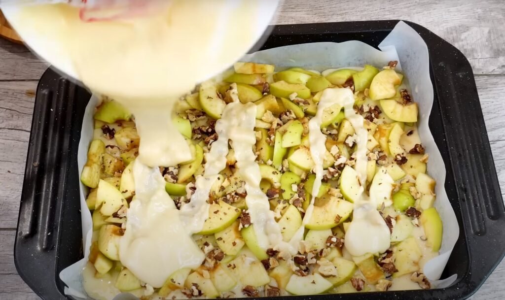 • Ant tešlos paskleiskite obuolių sluoksnį, pabarstykite stambiai smulkintais graikiniais riešutais.
