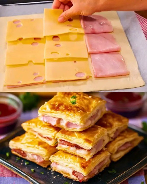 Šie sluoksniuotos tešlos pyragėliai su kumpio ir sūrio įdarų yra paprastai paruošiami, labai skanūs ir puikiai tinkantis vakarėliams ar greitiems šeimos pietums!