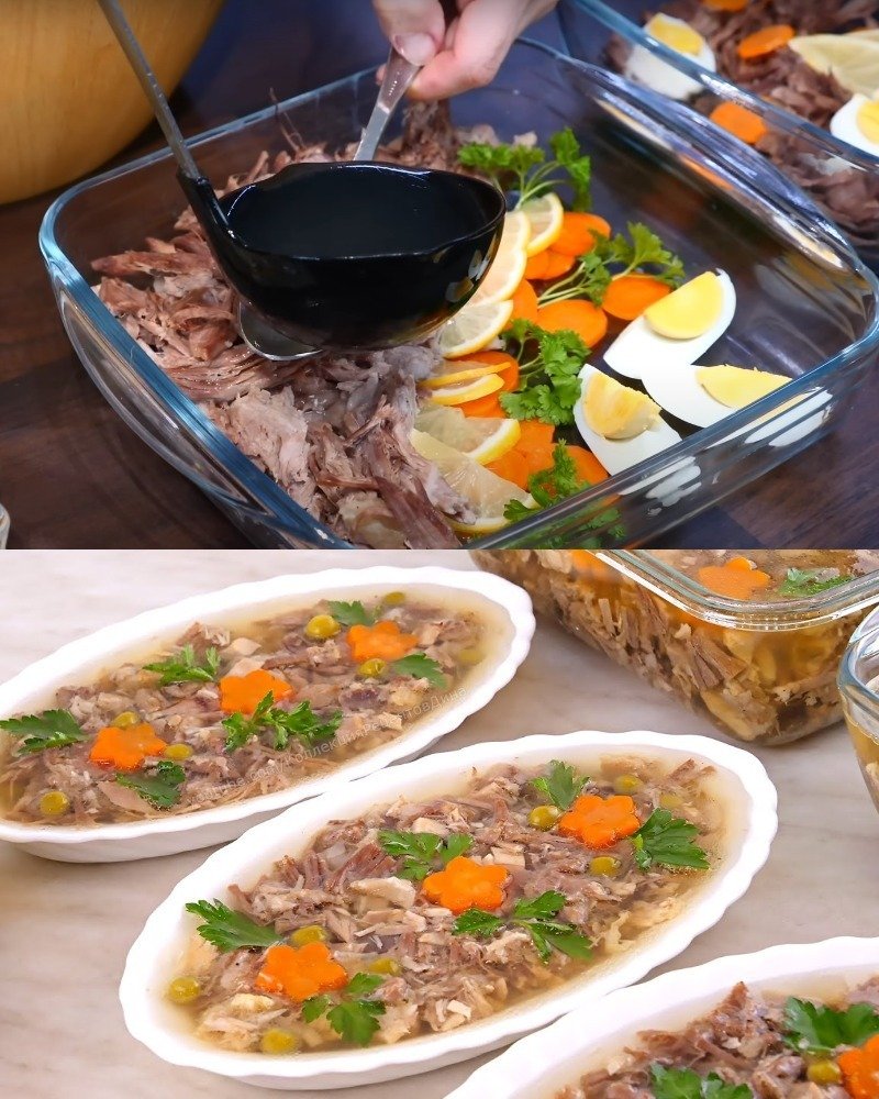 - Užpylimas ir stingdymas: želatinos tirpalą sumaišykite su likusiu sultiniu ir užpilkite ant šaltienos masės. Pirmiausia atvėsinkite kambario temperatūroje, vėliau dėkite į šaldytuvą 8–12 valandų, kad sustingtų.