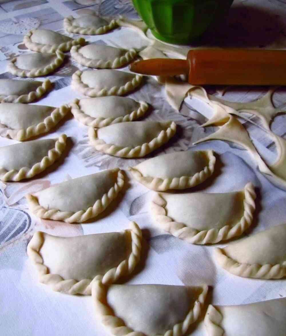 • Tešlą iškočiokite ir stikline išspauskite apskritimus. Ant kiekvieno apskritimo dėkite šaukštelį įdaro, kraštus užspauskite šakute arba užraitokite.
